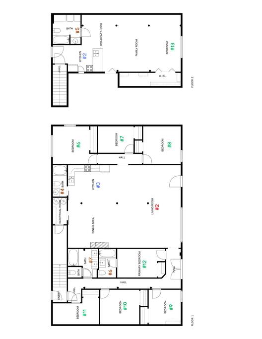 HOUSE DESCRIPTION: The house is a 5 bedroom 3 full bathroom ranch style home that will sleep 15 max. It has a very spacious living room that will host lots of people. It also has a fenced-in backyard for approved pets along with lots of outside space for fun activities. More house details: * Gated entrance with long private drive: every guest has a unique 4 digit code to enter. * Parking: lots of parking in front of the garage or along the drive in front of the house. * BR 1- king bed, 32" smart TV, attached to full bath with jacuzzi and walk-in closet. Sleeps 2 max. * BR 2- queen bed with 32" smart TV. Sleeps 2 max. * BR 3- 3 full beds & 32" smart TV. Sleeps 6 max. * BR 4- 1 full bed. Sleeps 2 max. * BR 5- 1 queen bed. Sleeps 2 max. * Living room- very spacious at about 1000 sqft with a sofa sleeper, 86" smart LG TV. Sleeps 1 max. * Kitchen- fully stocked for cooking needs, walk-in pantry, full bath connected, & coffee bar. * Back porch- laundry area which connects to the back patio. * Garage- one car is available which is connected to the house. * Front porch- screened in with seating and a swing to view a beautiful sunrise. * Fire pit- wood provided with a box that has lighter, paper, & roasting sticks. * Back patio- propane grill with fenced-in backyard. BARNDO DESCRIPTION: The barndo has 7 bedrooms on the main level with a loft studio suite on the upper that counts as the 8th bedroom that sleeps 25 max. The loft studio suite is a full living quarters with a kitchen, bath, laundry, with a deck out the back and a fenced in backyard for approved pets. The lower level has 3 full bathrooms along with a spacious gathering area. More barndo details: * Gated entrance with long private drive: every guest has a unique 4 digit code to enter. * Parking: lots of parking on the North, West, & South side. * BR 1- king bed, 32" smart TV, & attached full bath. Sleeps 2 max. * BR 2- queen bed with 32" smart TV. Sleeps 2 max. * BR 3- 2 full beds with 32" smart TV. Sleeps 4 max. * BR 4- 2 full beds with 32" smart TV. Sleeps 4 max. * BR 5- 1 king bed with 32" smart TV. Sleeps 2 max. * BR 6- 1 queen bed with 32" smart TV. Sleeps 2 max. * BR 7- 2 full beds with 32" smart TV. Sleeps 4 max. * BR 8- loft studio suite with king bed, sofa sleeper, & 2 twin folding beds with 44" smart TV. Sleeps 5 max. * Bedroom soundproofing- all interior walls insulated with solid core doors for bedroom privacy. * Heating/Cooling- all rooms have their own heating/cooling head to control temp to your liking. * Living room/Kitchen/Dining- very spacious at about 850 sq ft with fully stocked kitchen, dining table that seats 12, coffee bar, couches, & 70" smart Vizio TV. * Laundry area: laundry area is in the upper loft bath. * Fire pit- wood provided with a box that has lighter, paper, & roasting sticks. Also has 3 picnic tables. * Back yard- fenced back yard for pets. * Grill- propane grill located by the firepit and upper deck. * Back deck- deck is located off the loft with beautiful views.