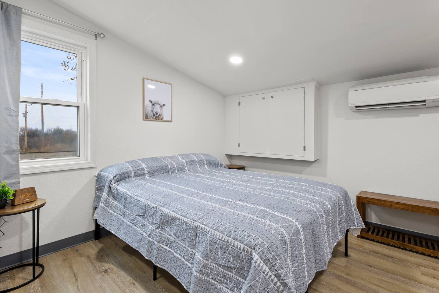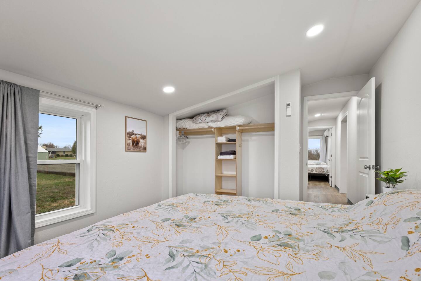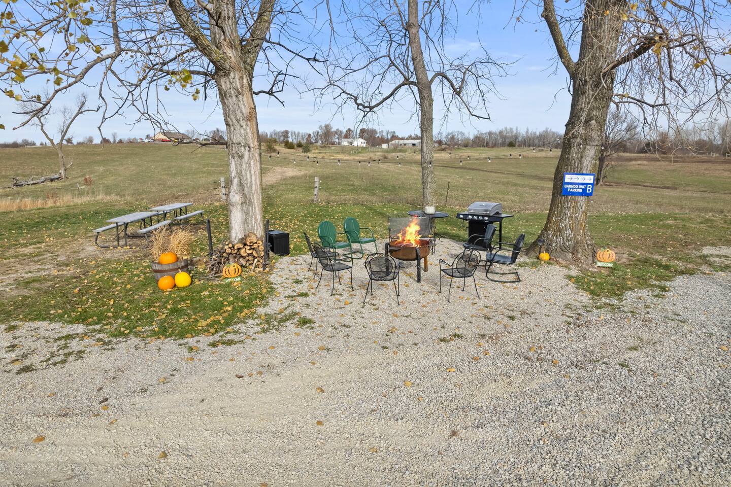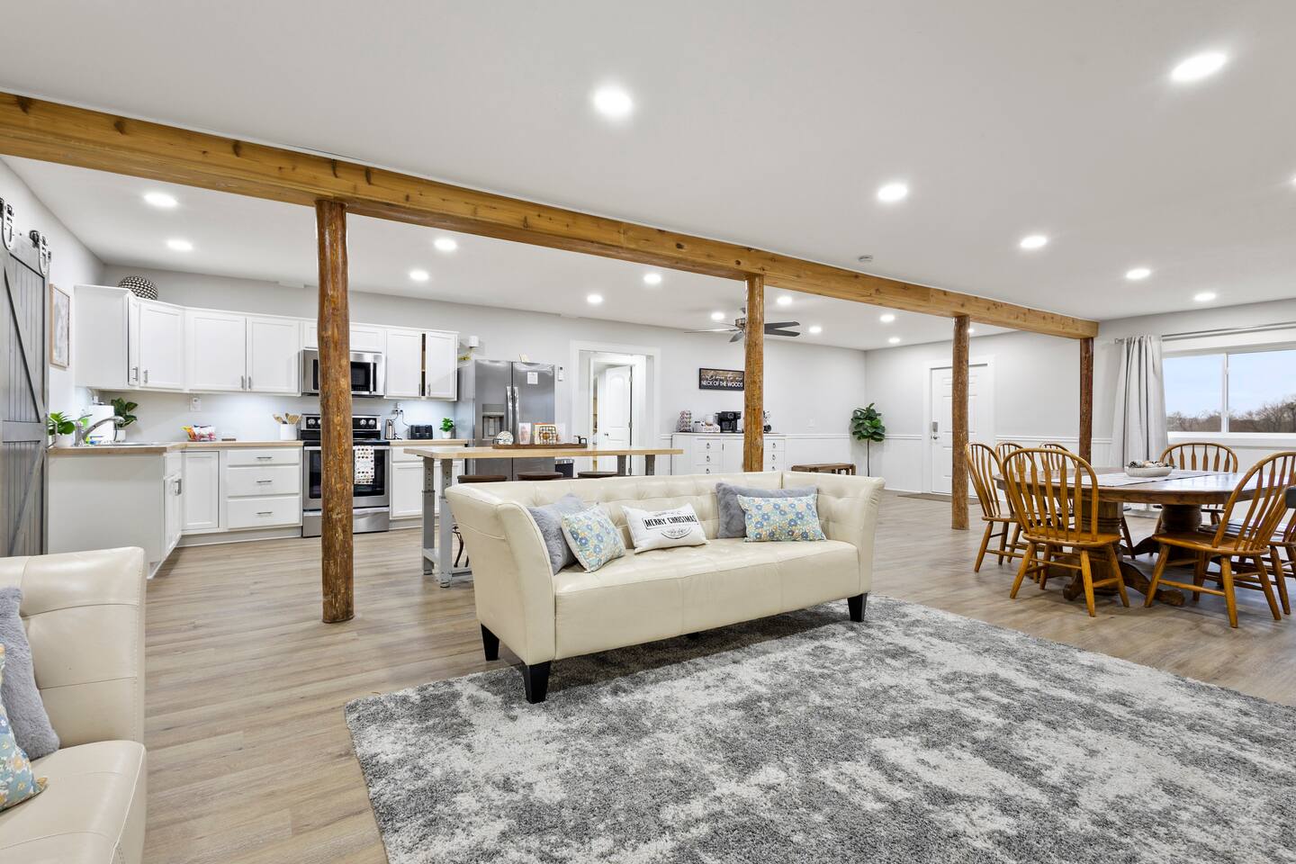 HOUSE DESCRIPTION: The house is a 5 bedroom 3 full bathroom ranch style home that will sleep 15 max. It has a very spacious living room that will host lots of people. It also has a fenced-in backyard for approved pets along with lots of outside space for fun activities. More house details: * Gated entrance with long private drive: every guest has a unique 4 digit code to enter. * Parking: lots of parking in front of the garage or along the drive in front of the house. * BR 1- king bed, 32" smart TV, attached to full bath with jacuzzi and walk-in closet. Sleeps 2 max. * BR 2- queen bed with 32" smart TV. Sleeps 2 max. * BR 3- 3 full beds & 32" smart TV. Sleeps 6 max. * BR 4- 1 full bed. Sleeps 2 max. * BR 5- 1 queen bed. Sleeps 2 max. * Living room- very spacious at about 1000 sqft with a sofa sleeper, 86" smart LG TV. Sleeps 1 max. * Kitchen- fully stocked for cooking needs, walk-in pantry, full bath connected, & coffee bar. * Back porch- laundry area which connects to the back patio. * Garage- one car is available which is connected to the house. * Front porch- screened in with seating and a swing to view a beautiful sunrise. * Fire pit- wood provided with a box that has lighter, paper, & roasting sticks. * Back patio- propane grill with fenced-in backyard. BARNDO DESCRIPTION: The barndo has 7 bedrooms on the main level with a loft studio suite on the upper that counts as the 8th bedroom that sleeps 25 max. The loft studio suite is a full living quarters with a kitchen, bath, laundry, with a deck out the back and a fenced in backyard for approved pets. The lower level has 3 full bathrooms along with a spacious gathering area. More barndo details: * Gated entrance with long private drive: every guest has a unique 4 digit code to enter. * Parking: lots of parking on the North, West, & South side. * BR 1- king bed, 32" smart TV, & attached full bath. Sleeps 2 max. * BR 2- queen bed with 32" smart TV. Sleeps 2 max. * BR 3- 2 full beds with 32" smart TV. Sleeps 4 max. * BR 4- 2 full beds with 32" smart TV. Sleeps 4 max. * BR 5- 1 king bed with 32" smart TV. Sleeps 2 max. * BR 6- 1 queen bed with 32" smart TV. Sleeps 2 max. * BR 7- 2 full beds with 32" smart TV. Sleeps 4 max. * BR 8- loft studio suite with king bed, sofa sleeper, & 2 twin folding beds with 44" smart TV. Sleeps 5 max. * Bedroom soundproofing- all interior walls insulated with solid core doors for bedroom privacy. * Heating/Cooling- all rooms have their own heating/cooling head to control temp to your liking. * Living room/Kitchen/Dining- very spacious at about 850 sq ft with fully stocked kitchen, dining table that seats 12, coffee bar, couches, & 70" smart Vizio TV. * Laundry area: laundry area is in the upper loft bath. * Fire pit- wood provided with a box that has lighter, paper, & roasting sticks. Also has 3 picnic tables. * Back yard- fenced back yard for pets. * Grill- propane grill located by the firepit and upper deck. * Back deck- deck is located off the loft with beautiful views.