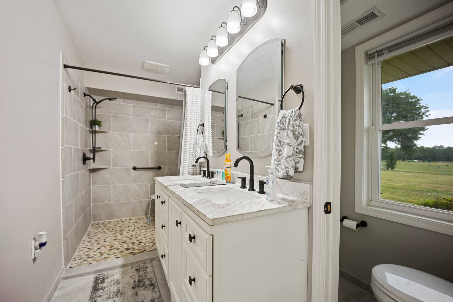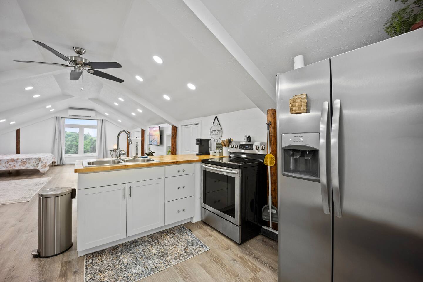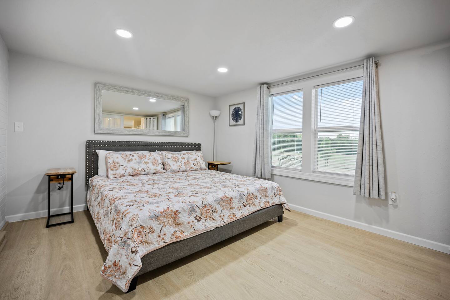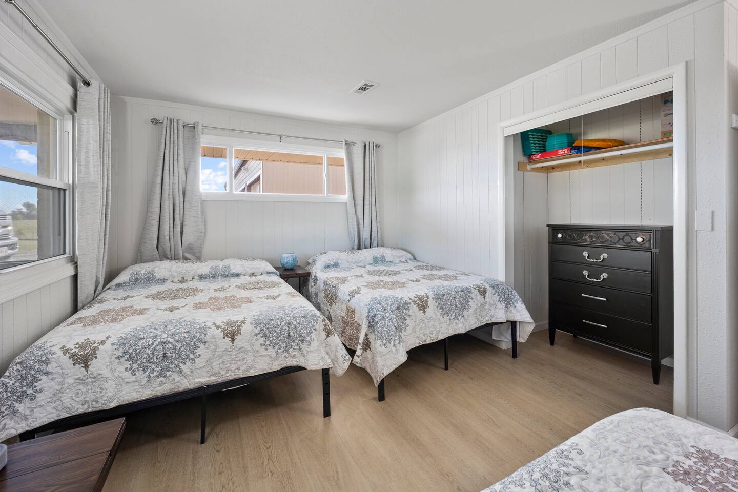 HOUSE DESCRIPTION: The house is a 5 bedroom 3 full bathroom ranch style home that will sleep 15 max. It has a very spacious living room that will host lots of people. It also has a fenced-in backyard for approved pets along with lots of outside space for fun activities. More house details: * Gated entrance with long private drive: every guest has a unique 4 digit code to enter. * Parking: lots of parking in front of the garage or along the drive in front of the house. * BR 1- king bed, 32" smart TV, attached to full bath with jacuzzi and walk-in closet. Sleeps 2 max. * BR 2- queen bed with 32" smart TV. Sleeps 2 max. * BR 3- 3 full beds & 32" smart TV. Sleeps 6 max. * BR 4- 1 full bed. Sleeps 2 max. * BR 5- 1 queen bed. Sleeps 2 max. * Living room- very spacious at about 1000 sqft with a sofa sleeper, 86" smart LG TV. Sleeps 1 max. * Kitchen- fully stocked for cooking needs, walk-in pantry, full bath connected, & coffee bar. * Back porch- laundry area which connects to the back patio. * Garage- one car is available which is connected to the house. * Front porch- screened in with seating and a swing to view a beautiful sunrise. * Fire pit- wood provided with a box that has lighter, paper, & roasting sticks. * Back patio- propane grill with fenced-in backyard. BARNDO DESCRIPTION: The barndo has 7 bedrooms on the main level with a loft studio suite on the upper that counts as the 8th bedroom that sleeps 25 max. The loft studio suite is a full living quarters with a kitchen, bath, laundry, with a deck out the back and a fenced in backyard for approved pets. The lower level has 3 full bathrooms along with a spacious gathering area. More barndo details: * Gated entrance with long private drive: every guest has a unique 4 digit code to enter. * Parking: lots of parking on the North, West, & South side. * BR 1- king bed, 32" smart TV, & attached full bath. Sleeps 2 max. * BR 2- queen bed with 32" smart TV. Sleeps 2 max. * BR 3- 2 full beds with 32" smart TV. Sleeps 4 max. * BR 4- 2 full beds with 32" smart TV. Sleeps 4 max. * BR 5- 1 king bed with 32" smart TV. Sleeps 2 max. * BR 6- 1 queen bed with 32" smart TV. Sleeps 2 max. * BR 7- 2 full beds with 32" smart TV. Sleeps 4 max. * BR 8- loft studio suite with king bed, sofa sleeper, & 2 twin folding beds with 44" smart TV. Sleeps 5 max. * Bedroom soundproofing- all interior walls insulated with solid core doors for bedroom privacy. * Heating/Cooling- all rooms have their own heating/cooling head to control temp to your liking. * Living room/Kitchen/Dining- very spacious at about 850 sq ft with fully stocked kitchen, dining table that seats 12, coffee bar, couches, & 70" smart Vizio TV. * Laundry area: laundry area is in the upper loft bath. * Fire pit- wood provided with a box that has lighter, paper, & roasting sticks. Also has 3 picnic tables. * Back yard- fenced back yard for pets. * Grill- propane grill located by the firepit and upper deck. * Back deck- deck is located off the loft with beautiful views.